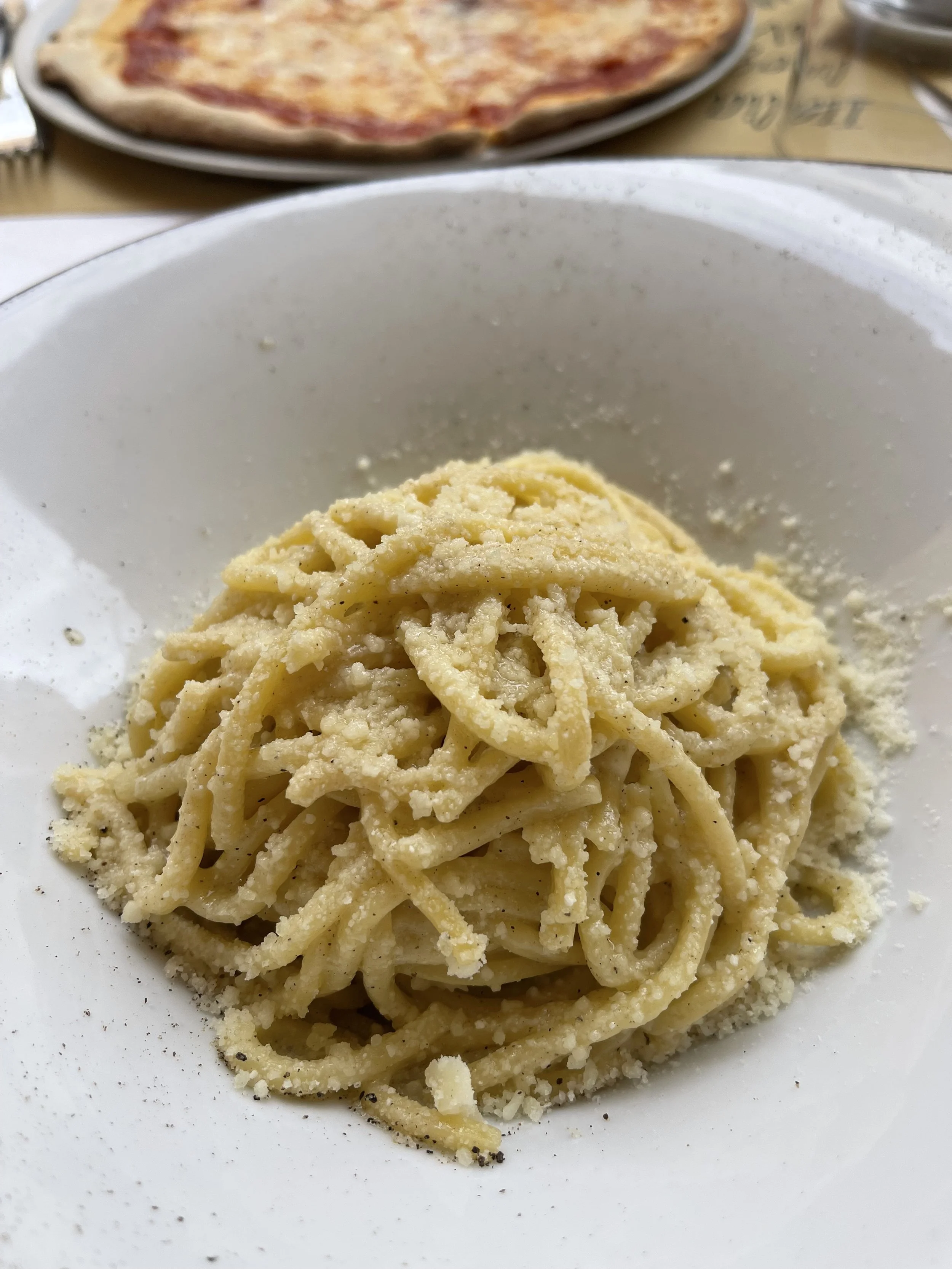 Cacio and Pepe is a classic Roman dish and is my personal favorite. The ingredients consist of parmesan cheese, pepper and fresh pasta. I love this dish because it is simple and delicious.